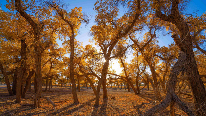 每到秋天,额济纳旗的胡杨林便成了摄影师的天堂。金色的胡杨像是在天地间挥洒出的巨大油画,树叶在阳光下闪烁着耀眼的光芒,仿佛一场盛大的秋日狂欢。胡杨树矗立在荒漠里,静静守护着岁月的故事。
