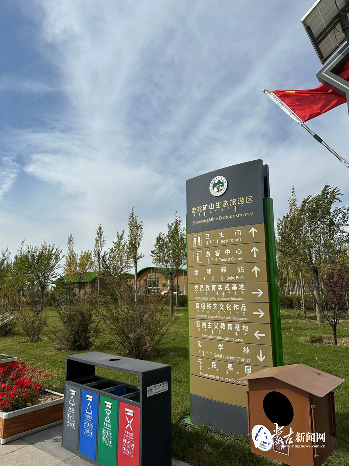 金秋时节,准能黑岱沟露天煤矿生态旅游区绿树成荫,花草繁茂,与粗犷的煤矿形成鲜明对比。蓝天白云下,绿色的植被与黑色的煤炭交相辉映,各种主题集中展示矿区开采资源的风貌,登高远眺,尽收眼底的是一望无垠的葱绿,各种植被镶嵌在高低起伏的山峦中,构成了一副独特的工业与生态和谐共生的画卷。