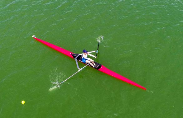 2023年8月19日,在鄂尔多斯市康巴什区乌兰木伦湖,赛艇运动爱好者在女子单人双桨1000米比赛中。新华社发