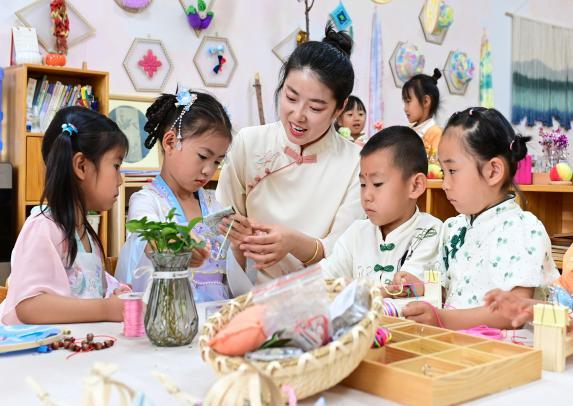 2024年6月5日,鄂尔多斯市康巴什区第十二幼儿园的老师指导孩子们做香囊、编织五彩绳。新华社发