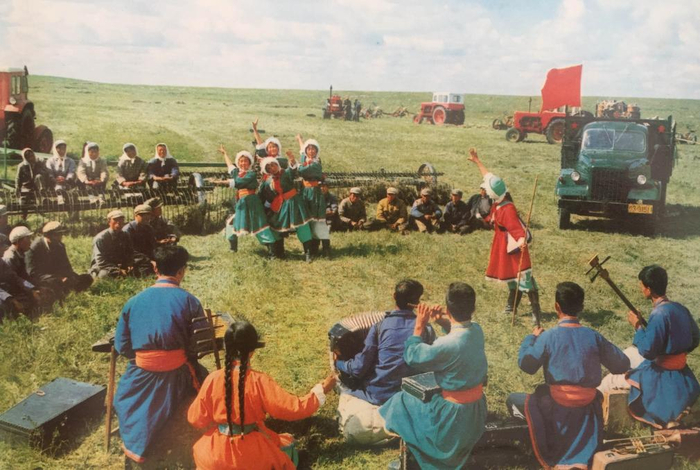 20世纪70年代,锡林郭勒盟乌兰牧骑队员在草原上为牧民演出。新华社发