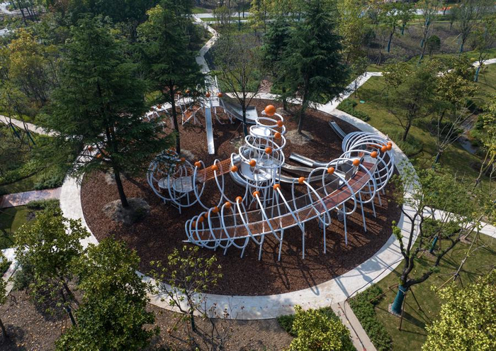 园内核心区域的3公顷绿地,以“森林下面有什么”为故事线,布局了一系列由本土昆虫元素演变而来的可参与景观装置,如“蚕宝宝”乐园、“千足虫“躺椅、“竹节虫”秋千、“刺蛾茧”探险洞等,让孩子在玩乐中认识自然。同时,在树林中布局以科普教育、亲子研学为主题功能的“树篱学堂”,打造公园式自然教育课堂。
