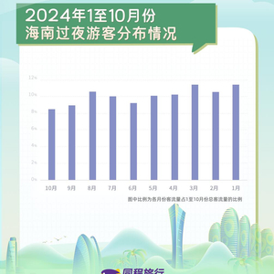 从各月份的过夜客流量(有住宿消费的游客量)分布来看,今年1至10月份,海南过夜游客总量中各月份占比基本保持在10%上下,各月份的客流量相对稳定,整体的消费热度持续性较好,没有特别明显的消费淡季。