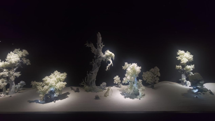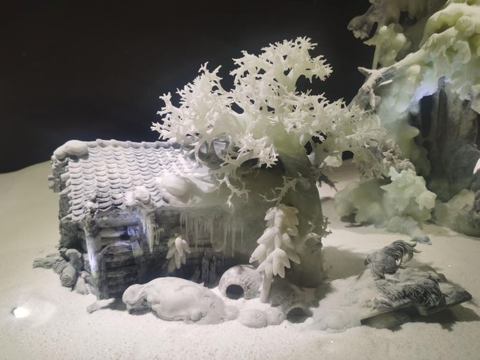“银装素裹、玉树琼花”,这些只有在冬季才能看到的雪后美景,在位于岫岩前营镇新屯村的唐帅艺术馆内却能四季常见。黑白玉为主材料的“家在东北”系列展厅里,树、人、物,皆沉浸在满天雪花里,腌酸菜、制作黏豆包等东北民俗,以及北方冬季特有的雾凇美景被一一雕刻于温润光洁的岫玉上。