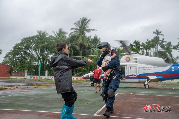 10月30日,在海南省琼海市石壁镇,交通运输部南海救助局的救援人员将刚救出的一位小孩子交给镇政府工作人员。海南日报全媒体记者 袁琛 摄