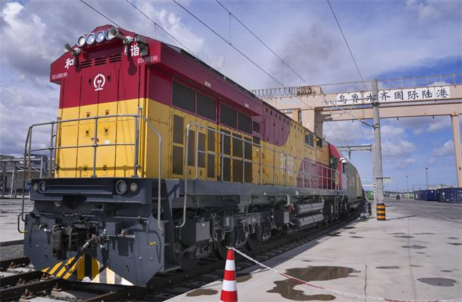 2024年5月27日,一列满载货物的中欧班列驶离新疆乌鲁木齐国际陆港区。新华社记者 王菲 摄/新华社图片库