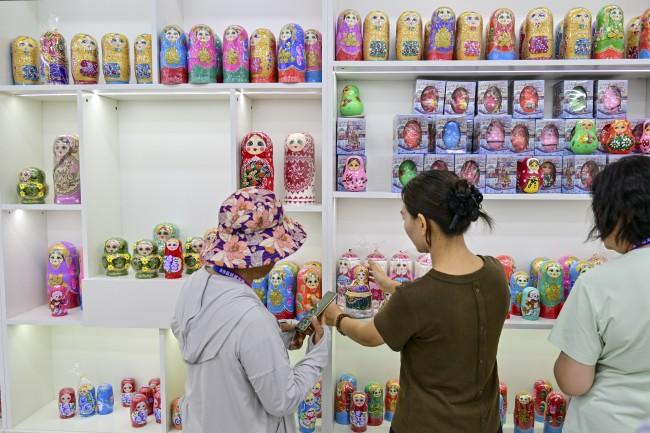 2024年7月26日,在中哈霍尔果斯国际边境合作中心,游客在免税店挑选商品。新华社记者 丁磊 摄/新华社图片库