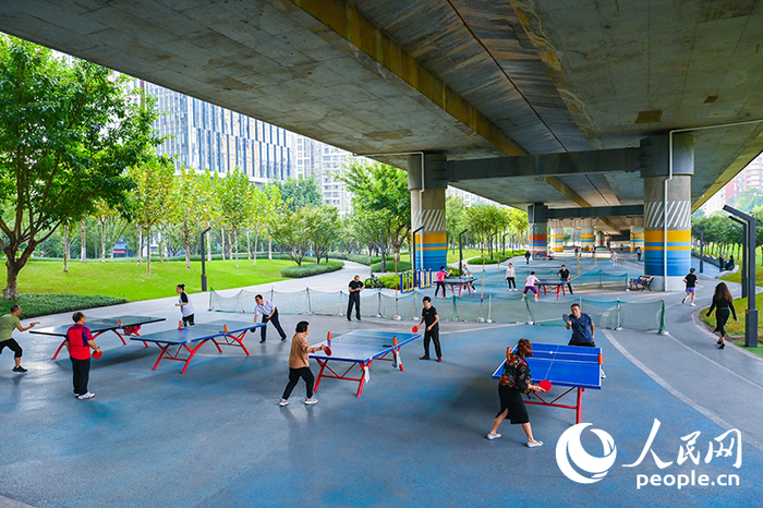 2024年10月16日,重庆市民在渝鲁园桥下空间运动场打乒乓球。位于重庆渝北区渝鲁大道鲁能星城十三街区段的渝鲁园曾是建筑荒地,当地将桥下“灰空间”改造成了活动场所,健身漫步道、乒乓球场、羽毛球场、儿童活动场一应俱全。人民网 邹乐摄
