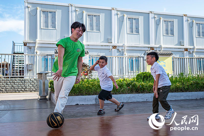 2024年7月24日,在上海临港新片区建设者小镇中建八局105社区,大学生志愿者带领爱心暑托班的小朋友们一起做游戏。上海市小学生爱心暑托班已连续11年被列入上海市为民办实事项目,帮助家长解决孩子暑期“看护难”问题。人民网记者 王初摄