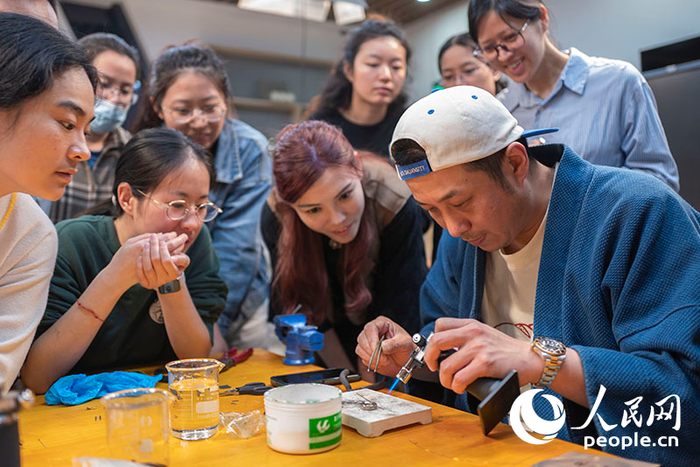 2024年5月7日,上海市宝山区淞南镇社区文化活动中心教学点,老师(右一)正在教授复古手工银饰制作技艺。据介绍,上海市民艺术夜校创办于2016年,通过延时开放、公益性收费的方式,在晚间时段服务18岁至55岁人群,满足不同社会群体的文化需求。人民网记者 王初摄