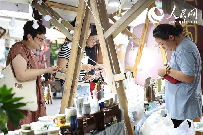 2024年6月30日,江苏南京熙南里历史文化街区,游客在小摊前购买商品。老街区的开发利用搭上夜经济的顺风车,让老街巷烟火气十足。人民网 余乐摄