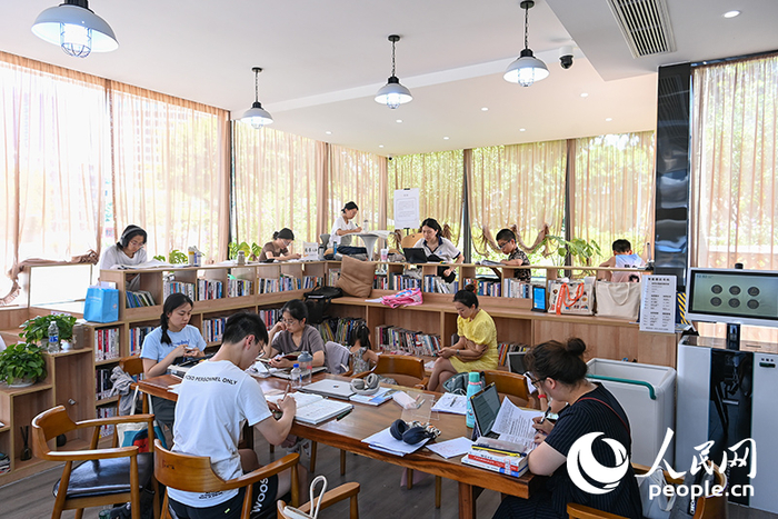 2024年8月8日,重庆两江新区星光天地城市智慧书房,不少市民在看书纳凉。近年来,重庆在社区、商圈等人流量集中的地区建设打造了上百家24小时自助城市书房,为市民提供阅读空间,成为市民提升自我修养的场所。人民网 邹乐摄