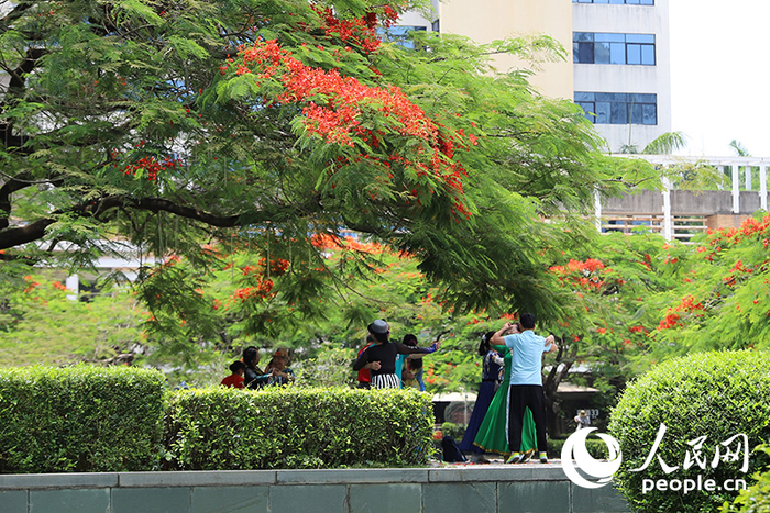 2024年5月15日,广东深圳市南山区华侨城生态广场,市民在凤凰花下起舞。近年来,深圳深入推进“山海连城 绿美深圳”生态建设,截至2023年底,全市公园数量达1290个,使市民能够推窗见绿、开门见园,形成人与自然相互依存的宜居范本。人民网 江佳玲摄