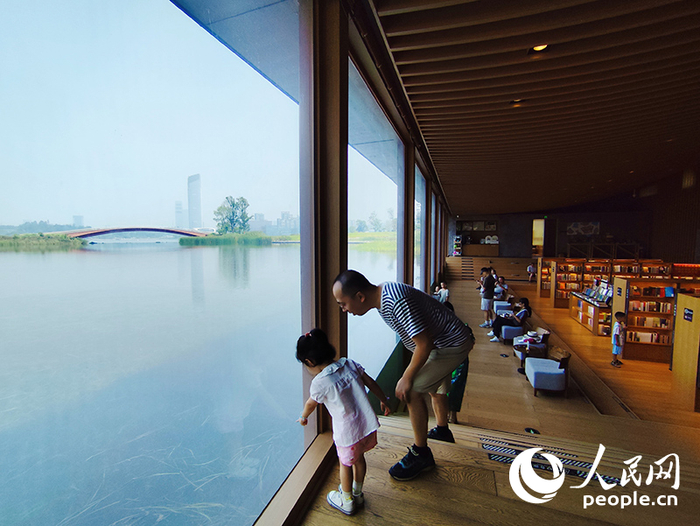 2024年8月21日,四川天府新区兴隆湖畔的“网红”书店——湖畔书店,市民正在观赏湖景。通过溶解城园边界、开放共享空间、提升水质等,兴隆湖被打造成城市生态湖泊,也成为市民休闲娱乐的好去处。人民网记者 朱虹摄