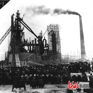 当年5月19日,钢铁厂1号100立方米高炉破土动工。当时,切割修筑炉膛用的钢板缺少切割设备,工人们抡起大锤用刻刀凿;吊装炉体没有高吨位起重机,工人们立起两根32米高的电线杆,拴上钢丝绳制成“两木搭”,5天就完成了炉体吊装。