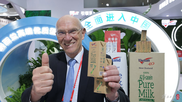罗伊·范登赫克展示今年新品,他说,中国进博会好,中国市场好,我们的牛奶销量好。