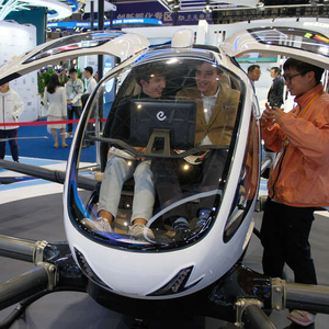 11月6日,上海,第七届中国国际进口博览会汽车展区,两名外国参观者正在体验一款中国自主研发的无人驾驶垂直起降飞行器。中青报·中青网记者 田嘉硕/摄