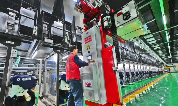 枝江三宁化工酰胺及尼龙新材料项目的纺丝车间,工人们正在边生产边调试自动化的进口设备。(湖北日报全媒记者 刘曙松 通讯员 毛晓娜 摄)