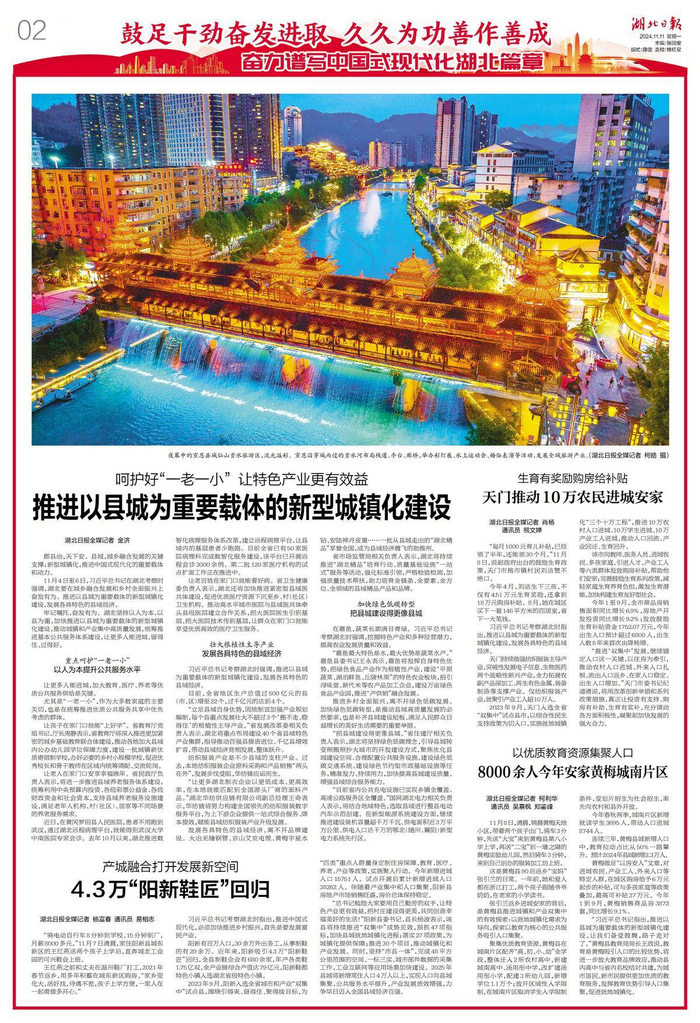 牢记嘱托,奋发有为。湖北坚持以人为本、以县为重,加快推进以县城为重要载体的新型城镇化建设,推动城镇和产业集中高质量发展,统筹推进基本公共服务体系建设,让更多人能进城、留得住、过得好。
