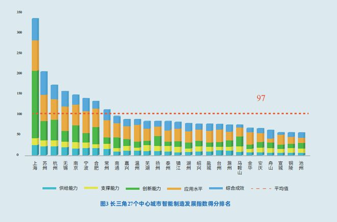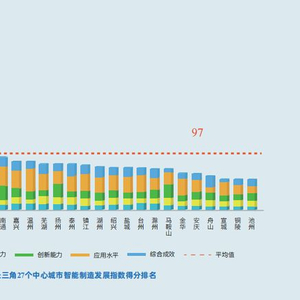 长三角地区27个中心城市智能制造指数平均值为97。上海市以总指数301分位居长三角各城市榜首,苏州、杭州、无锡紧随其后,得分分别为182154142,四个城市共同组成第一梯队。南京、宁波、合肥、常州处于第二梯队,综合指数在97140之间。