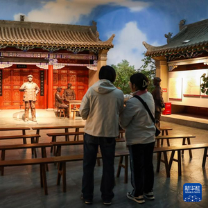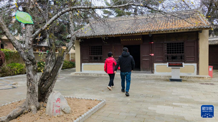 11月18日,游客走进全国重点文物保护单位哈达铺会议旧址中的毛泽东、张闻天住室(义和昌药铺)参观(无人机照片)。新华社记者 郎兵兵 摄