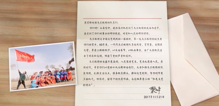 2017年11月21日,习近平总书记给苏尼特右旗乌兰牧骑的队员们回信,勉励他们大力弘扬乌兰牧骑的优良传统,扎根生活沃土,服务牧民群众,推动文艺创新,努力创作更多接地气、传得开、留得下的优秀作品,永远做草原上的“红色文艺轻骑兵”。