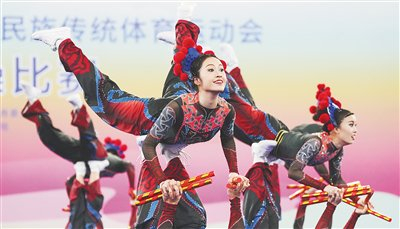 11月25日,比赛中的广东民族健身操代表队选手。