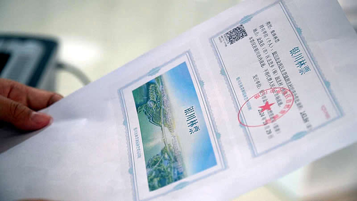 11月26日上午11时许,在银川市民大厅“六权”交易服务大厅,金凤区丰登镇润丰村村委会主任王强拿到了140亩村集体林地的纸质版“林票”,他心里一下子踏实了。