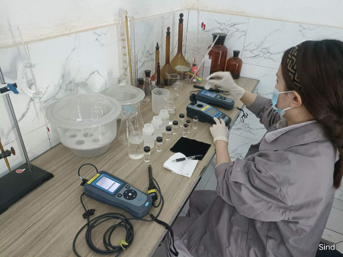 塔尔运维项目制水水厂工作人员正在检测水质。