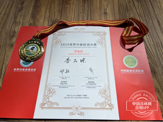 2024年世界中餐欧洲大赛,是由世界中餐业联合会和中西美食交流协会主办的国际赛事,包括中国在内的8个国家的40多名中餐名厨在西班牙马德里进入最后角逐,尤其是大赛两个最高奖——特金奖竞争激烈。李石琮作为吉林市派出的代表,克服时间紧、工艺复杂等各种不利条件,稳定发挥厨艺,三道参赛菜品创意均融入吉林市的特色文化符号。他制作的五仁锅包肉,以吉林市“滑雪天堂”为背景,融入雪道、粉雪、滑雪人等元素。他制作的琉璃丸子,以玉米包裹雪蛤油彰显吉林市特产。他制作的满族黄坛子——打特乌拉佛跳墙,再现了吉林市作为满朝皇家天然食品供应基地的历史。大赛评委分别对他的菜品予以高度评价,评为特金奖。李石琮把锅包肉等吉菜传播到欧洲,用舌尖上的美味征服了外国友人,并在现场收了5名海外华人徒弟,让他们继续传扬中华美食文化和吉林市的美名。