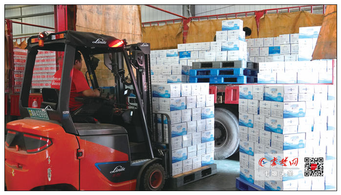工人们忙着将生产好的饮用水装上大货车运往各大城市