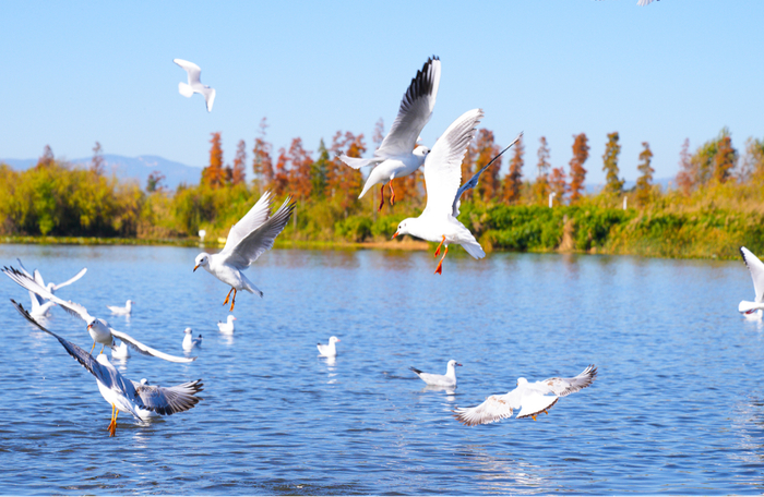 鸥鸟互动:洛龙公园内可投喂红嘴鸥,感受人与自然和谐共生的乐趣。