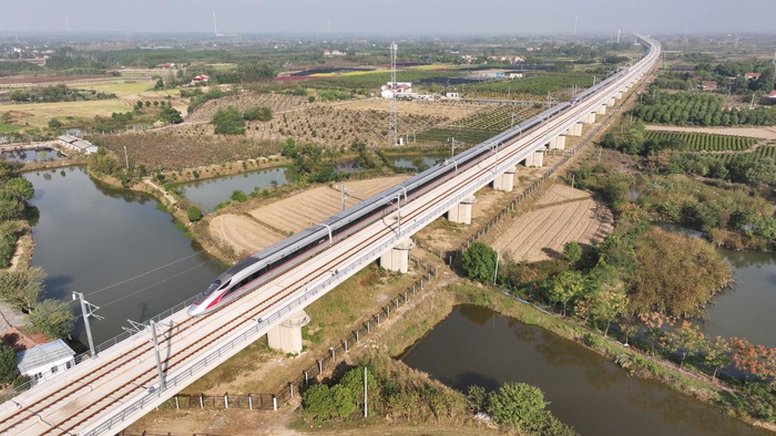 “‘荆荆高铁’是湖北省全资建设的第一条350km时速的高速铁路,2021年6月全线开工建设。该线路建成通车,将进一步完善鄂中区域综合交通体系,实现湖北省‘市市通高铁’。”湖北铁路集团荆荆铁路公司副总经理方立辉说,“荆荆高铁”新建桥梁14座,全长约65.41公里,占线路总长度的83.64%。