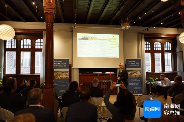 乐城先行区党委书记、管理局局长贾宁在海外推介会作《海南博鳌乐城国际医疗旅游先行区 创新药械企业进⼊中国市场的快速通道》的主题推介。受访者供图
