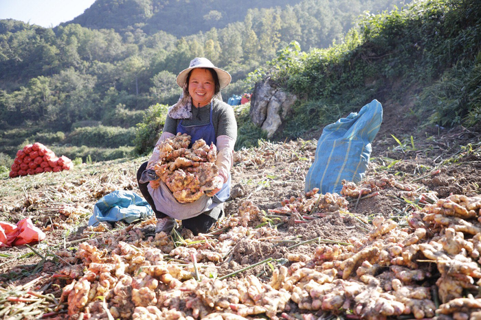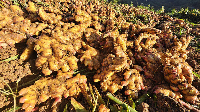 看到丰收的成果,生姜种植户罗文兵喜在心里。作为村里的生姜种植大户,罗文兵一边指导村民们按标准处理好刚挖出的生姜,一边忙着联系车辆前来运输,准备发往外地。