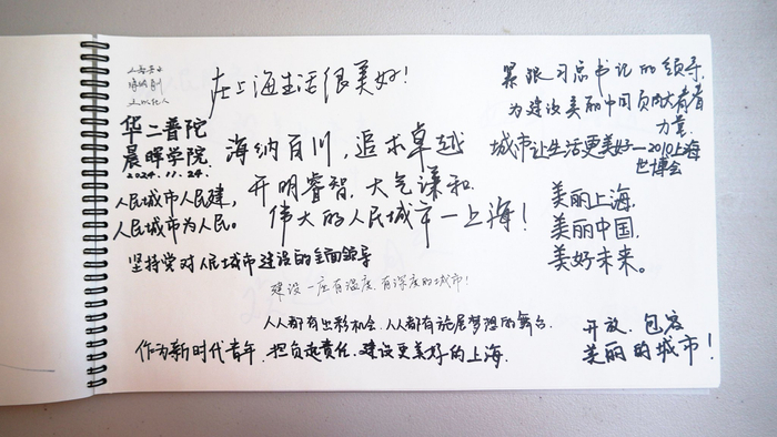 展览尾厅的留言本上,观众留言已经写满了整整6本。这400余条留言,不仅表达了市民对展览的认可,更寄托了对人民城市美好未来的期待。一位电影从业者留言:在展览中看到了自己参与制作发行电影的大幅海报,觉得特别自豪,这座城市记得每个人的努力。上海天文馆天文运维党支部参观后留言:展览全方位、全景式、系统地呈现了“人民城市”理念在上海的落地生根,我们会继续投入到创造美好生活的实践中。市民陈亮留言:身为上海人,看到展览中表现旧区改造的《晒台》情景剧特别亲切,我们的生活在上海的发展和进步中变得更好了,上海人民真的很幸福。来自闵行区的小朋友留言:在展厅看到了航天工作者的大照片,作为“航二代”我觉得很骄傲,长大了我也要好好建设我们的上海。浙江观众留言:五年成果展示,尽显上海发展的高度、速度、广度、厚度、温度、亮度,我们要把上海经验带回浙江。外国友人杰西卡留言:我喜欢这个展览,上海是我的第二故乡,是这个地球上最安全、温暖和热情的城市。退休老同志留言:展览主题明确、布置有序,应该让百姓们都来看看上海的新发展。教育工作者留言:展览中看到许多熟悉的场景和文化作品,有不少可以运用到自己的教育工作中,日新月异的上海已经成为真正的人民城市,生活在这里值得骄傲!