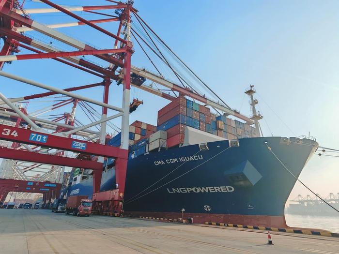 1月1日下午1点,随着一声汽笛长鸣,“万企出海 鲁贸全球”2025首发货轮“达飞伊瓜苏”驶离山东港口青岛港,前往地中海沿岸国家。