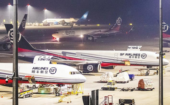 1月2日1时15分,花湖国际机场迎来新年首个工作日飞抵的首班全货机,6300余票货物在10分钟内被装卸完毕,由拖车运送至机场转运中心。(湖北日报全媒记者 薛婷 通讯员 王星予 摄)
