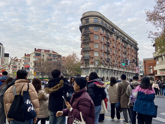 站在“百岁网红”武康大楼的路口,寒风瑟瑟,人群里有人捧着奶茶,也有人拿着冰淇淋,一时有些冷暖混乱。距离最近的奶茶店,新订单源源不断,店员们忙活得一刻不停,其中一位见缝插针地告诉记者:“各个国家的游客都有,韩国人比较多,点单的时候能听出来,要给他翻译饮品单,我们用手机翻译。”