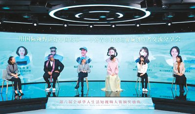 在第六届全球华人生活短视频大赛颁奖盛典上,中外青年优秀短视频创作者交流分享创作经验。