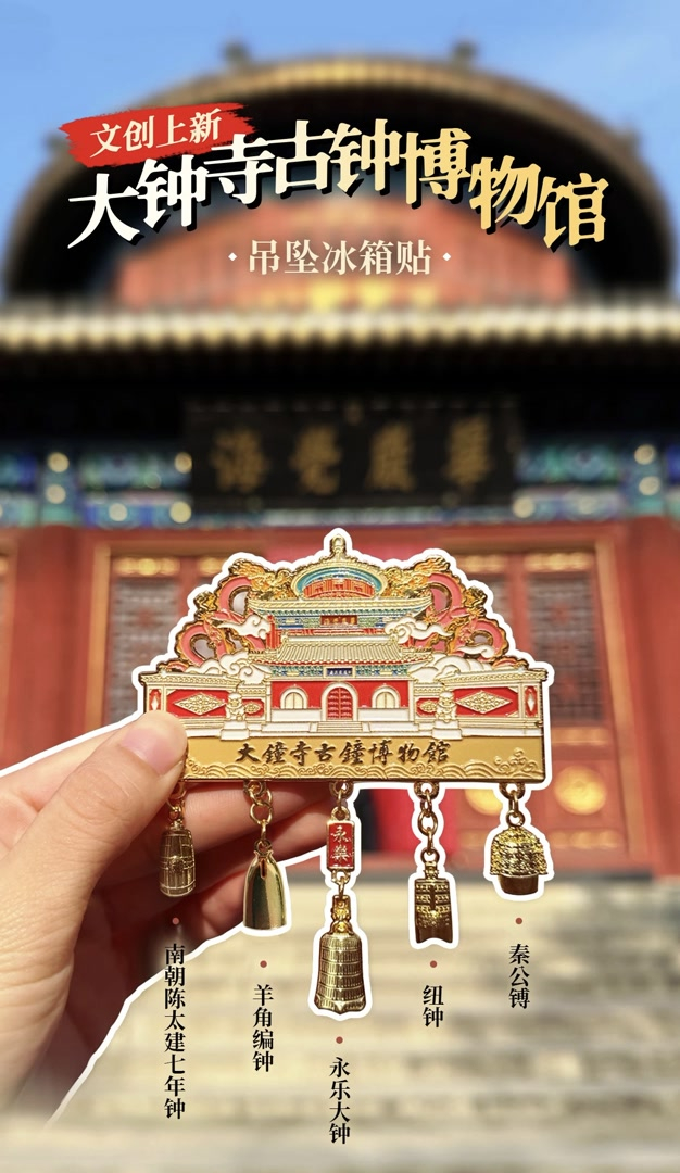 还有博物馆赶着新年打造“爆款”。大钟寺古钟博物馆推出了一款吊坠冰箱贴,1月1日上架即跃升销冠。该馆业务部主任杨巍介绍,这款冰箱贴将古建筑与文物有机结合,悬挂陈太建七年钟、羊角编钟、永乐大钟、纽钟、秦公镈5个装饰挂件,展示钟铃文化的独特魅力。“很多观众买它为了讨个好彩头,希望给亲友送上吉祥永乐的祝福。”