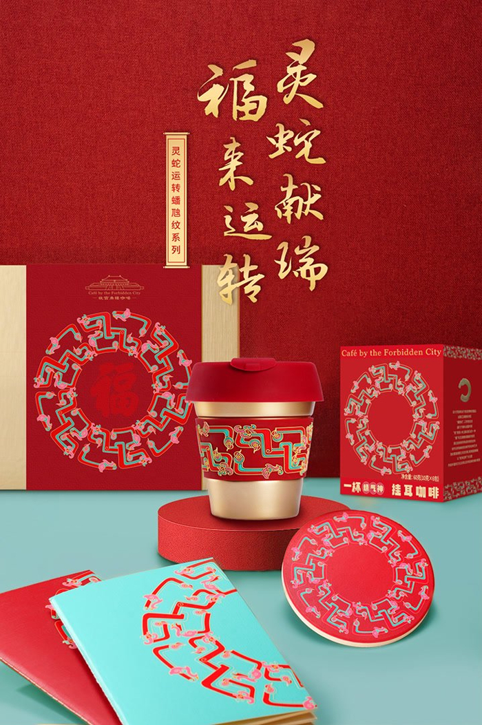 故宫角楼咖啡也推出了蛇年限定——灵蛇运转蟠虺纹精品咖啡杯,设计灵感是故宫院藏玉蟠虺纹佩。杯身以故宫红为底色,彰显浓浓吉庆氛围,蟠虺纹绕杯一周、首尾相联,象征圆满与团圆。