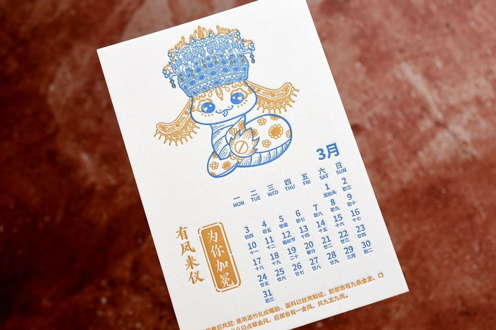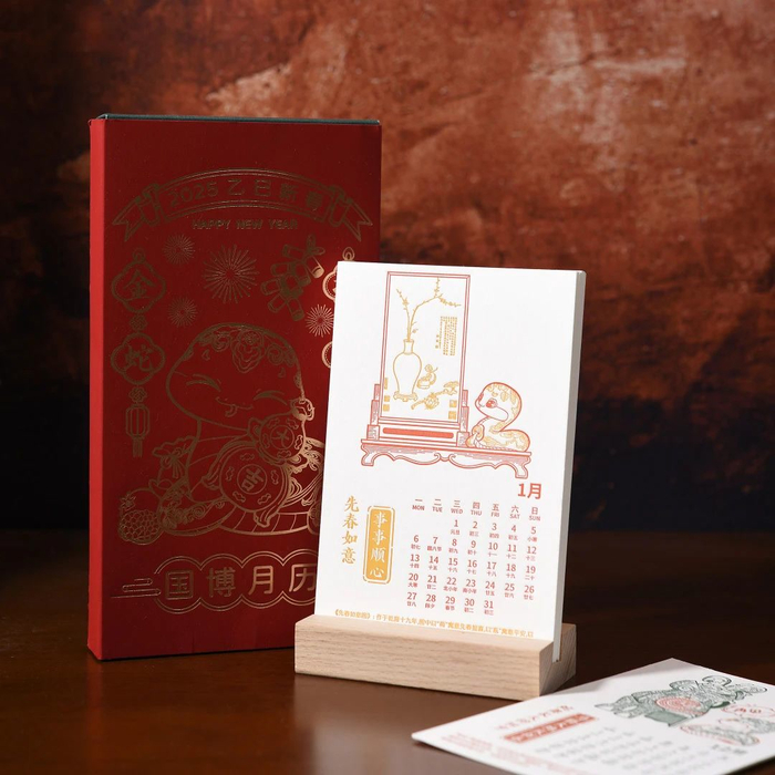 国家博物馆推出了一款活版印刷工艺打造的月历,邀请“吉祥蛇”与12件馆藏文物坐镇,带观众感受岁月流转。月历包装上,“吉祥蛇”怀抱粉彩大吉葫芦壁瓶,周身环绕各种吉祥元素。打开月历,每个月的图案和文字都与小蛇的形象巧妙融合。