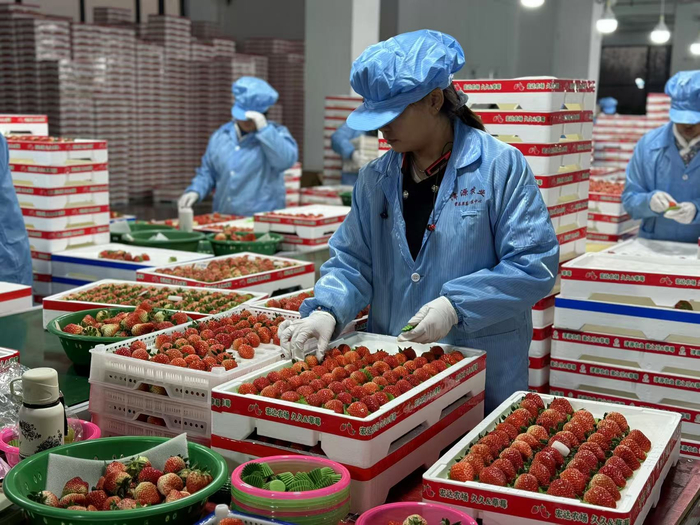 草莓产量很稳定,就要解决销售和运输的问题。今年刚投入使用的草莓交易市场便是工作队积极争取乡村振兴衔接资金所建设的。据该交易市场流水线负责人孙飞介绍,每天农户的草莓直接采摘了就送来这里,当晚就进行分拣、包装等程序,迅速通过物流发往全国各地,能够保证鲜果第二天就进入各大商超。