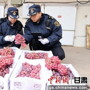 图为兰州海关所属敦煌机场海关关员对出口鲜葡萄进行查验。卢伟泽 摄