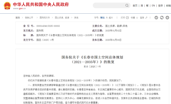 1月9日,中国政府网微信公号发布国务院关于《长春市国土空间总体规划(2021—2035年)》的批复,批复了对长春未来十年各类开发保护建设活动的基本依据。