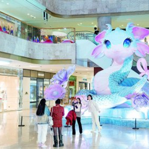 商场的夜间模式,也成为新引力。在德基广场一期一楼中庭,簇拥在粉色花朵中的蓝色“萌蛇”主题美陈前,一对情侣正在拍照。“22时以后的商场,以前只在晚场电影结束的时候看过,大部分区域是封闭熄灯的。”正在拍照的女士说,得知“德基24h”模式后,两人特地前来打卡,在夜间开放区域走走逛逛,“白天繁华、晚上清静,很新奇的体验。”