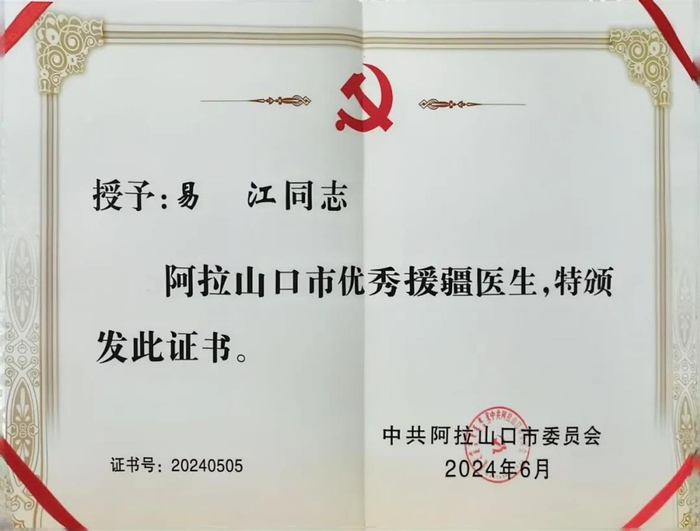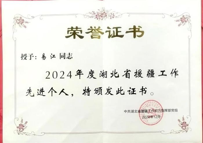 2023年7月,易江作为湖北省第九批援疆人才,远赴新疆阿拉山口市人民医院,开展为期一年半的医疗对口支援工作。援疆期间,易江充分发挥专业特长,深入基层服务,有力地促进了受援单位医疗水平、学科建设、人才培养方面的提升,被评为2024年度“湖北省援疆工作先进个人”、“优秀援疆医生”。