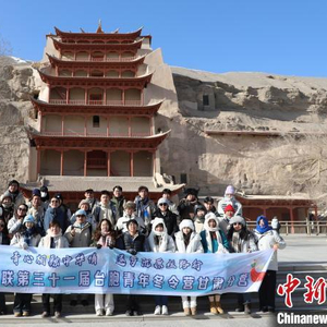 1月16日,全国台联第三十一届台胞青年冬令营甘肃分营的营员们参访敦煌莫高窟。杨娜 摄