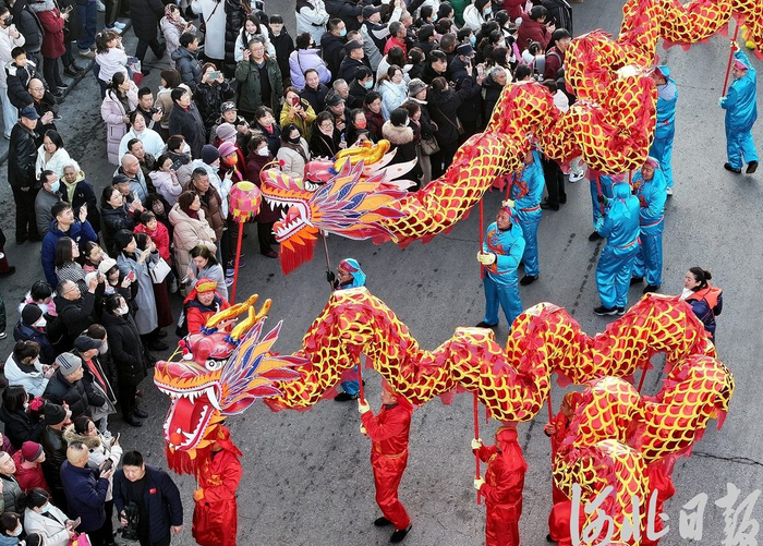 2024年2月12日,民间艺人在张家口市宣化区钟楼大街进行民俗巡演。(河北日报资料片)